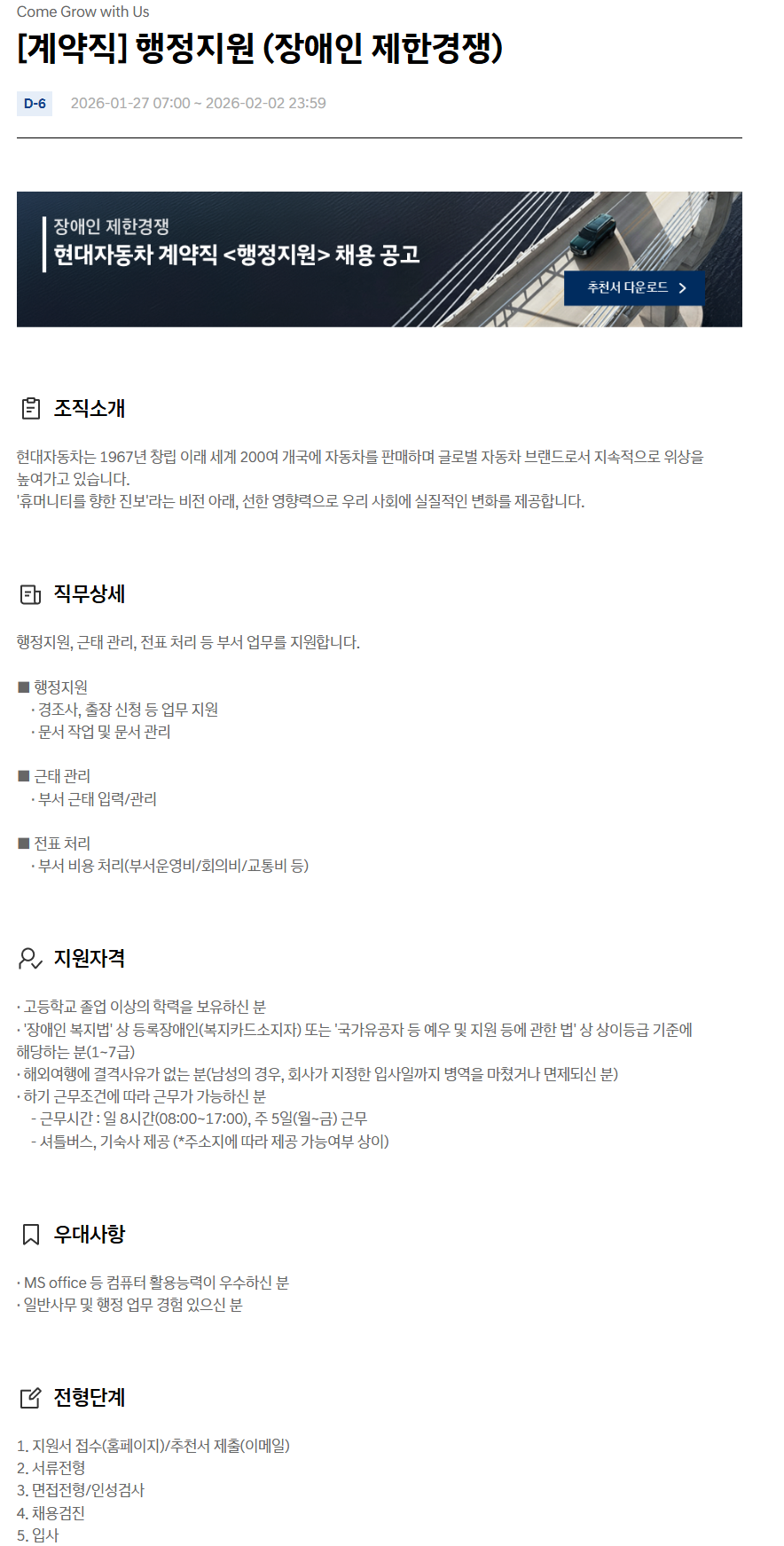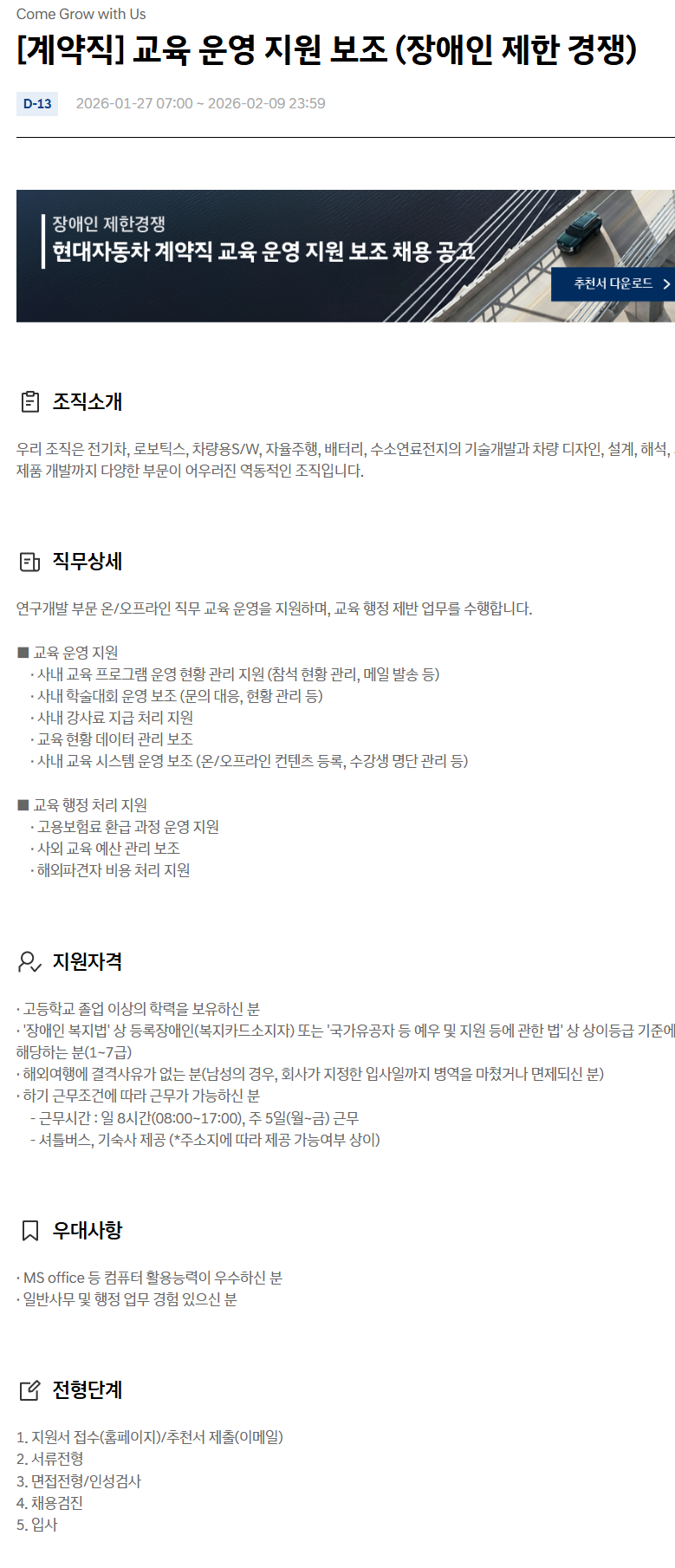 [현대자동차] 장애인 제한경쟁 계약직 공고 홍보